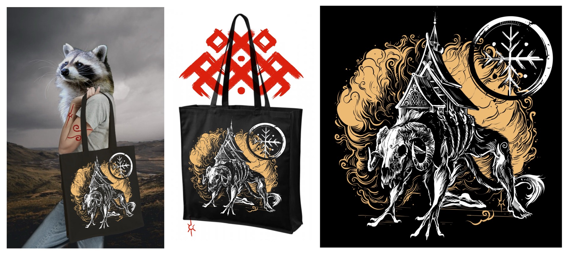 Jedná se o vysoce kvalitní digitální potisk bílou a okrovou barvou na černou tašku.